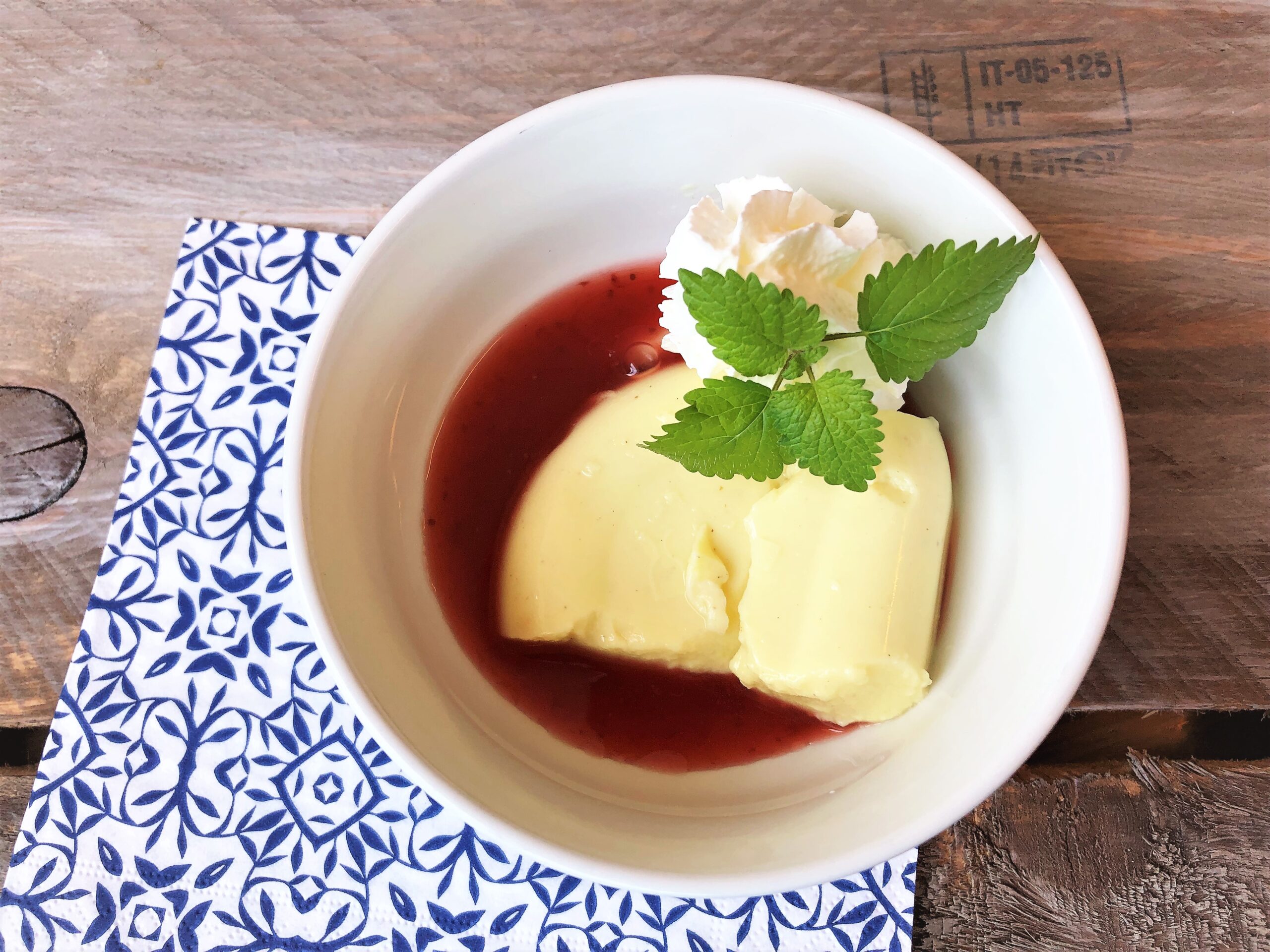 Vaniljepudding med jordbær og pasjonsfruktsaus