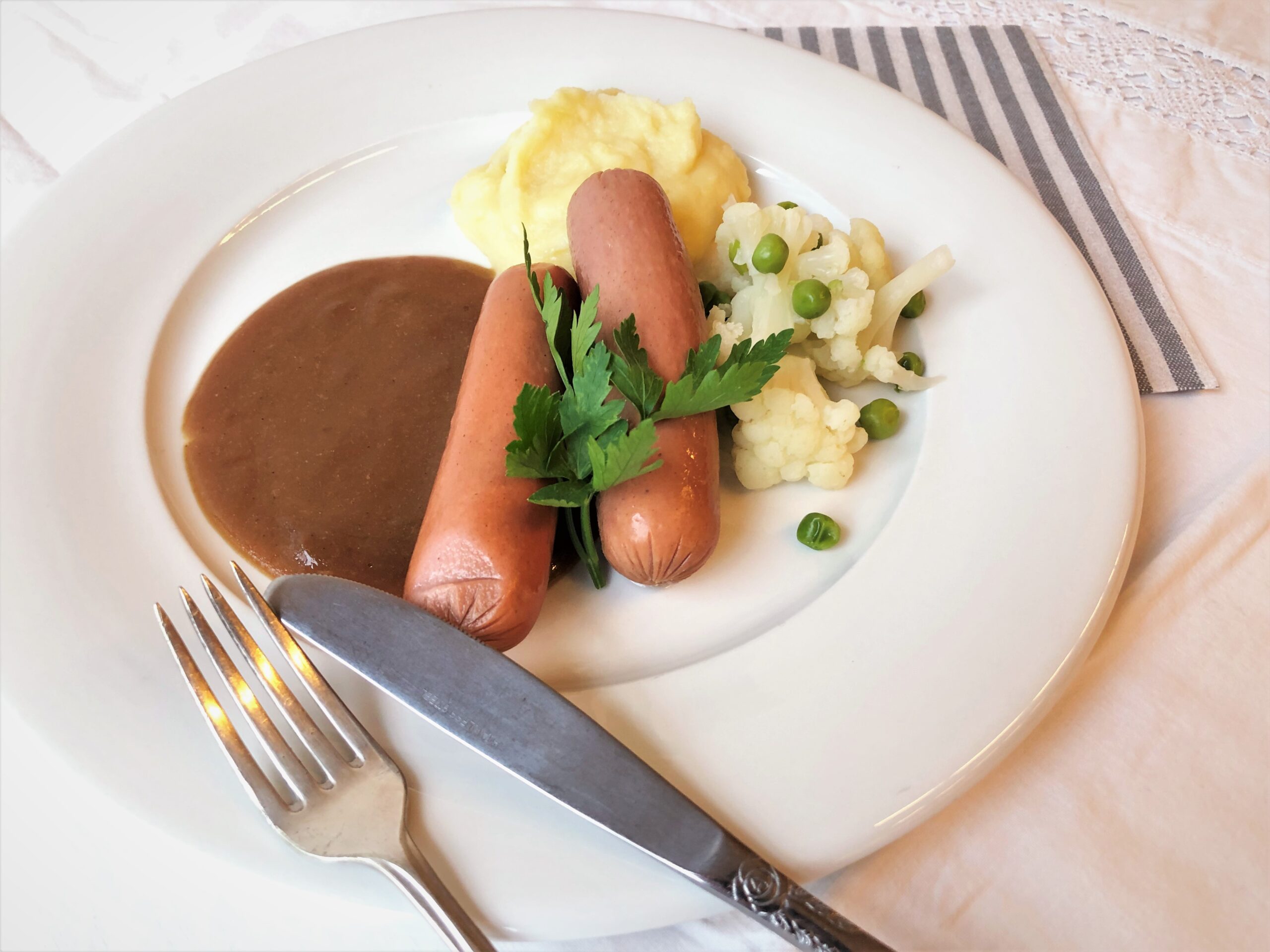 Kalkunpølse, brun saus, blomkål, ert og potetmos
